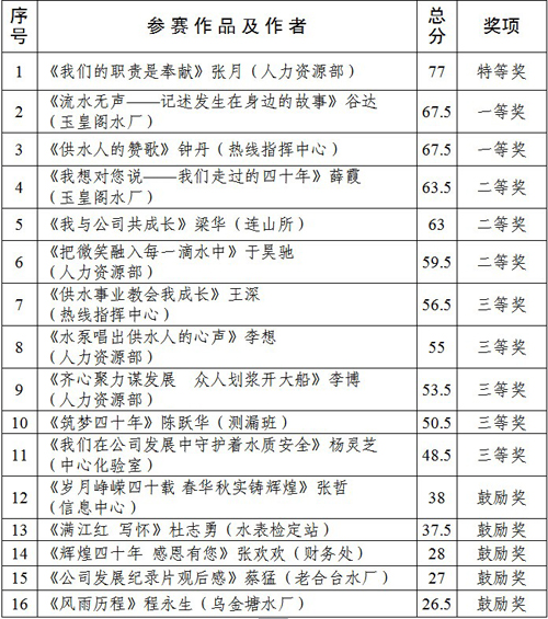 今年是自來(lái)水公司成立四十周年,為追尋企業(yè)四十年改革發(fā)展壯大的歷史軌跡,公司于今年8月份開展了“慶祝公司成立四十周年”征文比賽活動(dòng)。機(jī)關(guān)及各基層單位高度重視此次活動(dòng),干部職工熱情參與,立足本職崗位積極撰寫征文,作品充分展現(xiàn)了供水人四十年來(lái)艱苦奮斗、開拓創(chuàng)新、無(wú)私奉獻(xiàn)的精神風(fēng)貌,活動(dòng)開展以來(lái),共收到征文作品16篇。