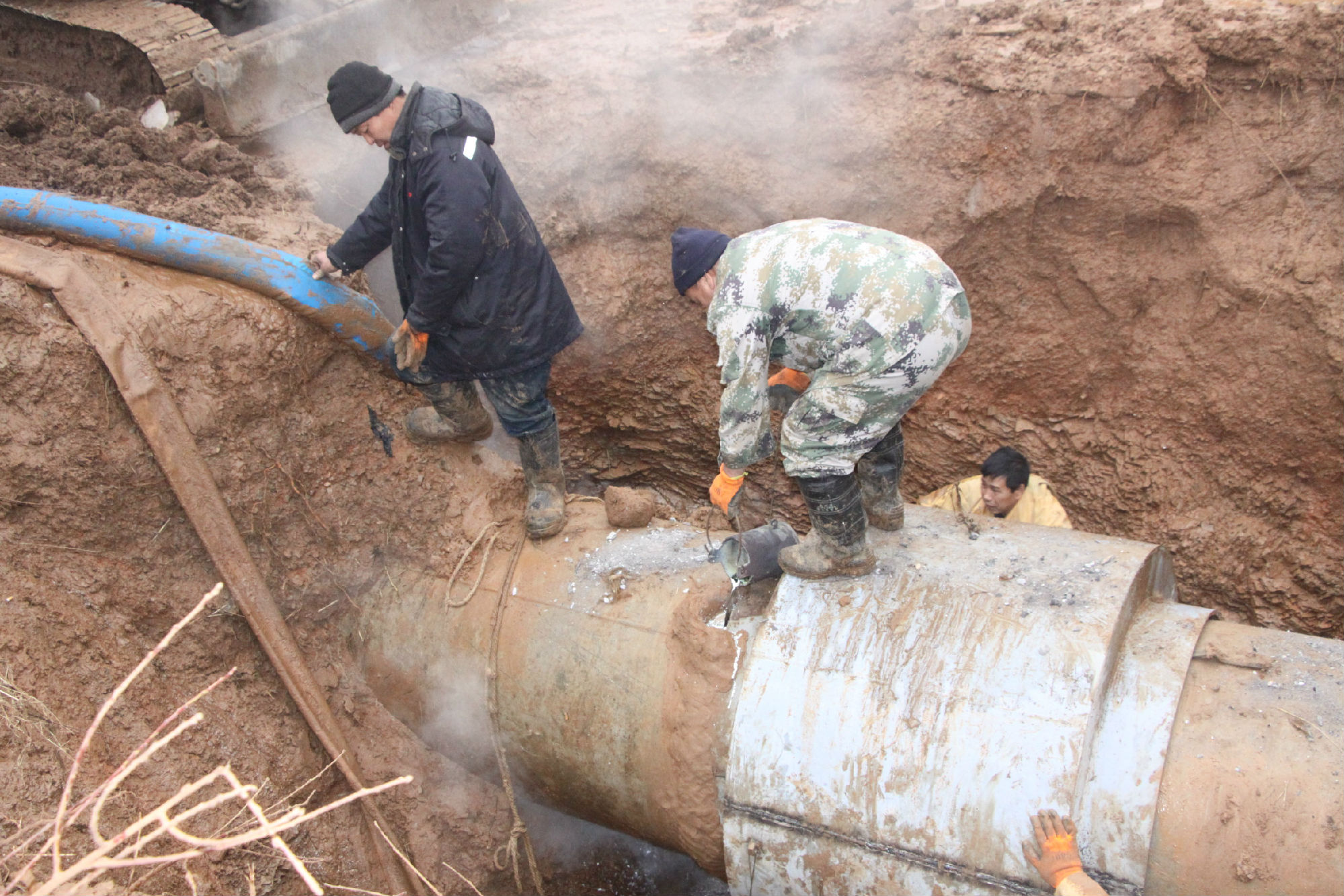 奮力搶修  12月1日早7時,施工人員開始搶修作業(yè)。由于天氣寒冷,地面結冰,給戶外施工造成很大困難。為爭取搶修時間,盡快恢復供水,搶修工程指揮部決定將預計15個小時的排水時間縮短到11個小時,然后一邊排水一邊作業(yè)。在緊張的搶修過程中,搶修人員分工明確、密切配合?,F(xiàn)場一片泥濘,施工人員輪番下到水坑里作業(yè),穿著單薄的防水服在冰冷的泥水里一站就是幾個小時,沒有一個人叫苦喊累。排水、裝卡子、電焊、灌鉛、打卡子,一道道工序施工,緊張而又有條不紊。搶修是野外作業(yè),沒有吃熱乎飯的條件,餓了只能以面包和香腸充饑,現(xiàn)場指揮和施工人員始終堅守在搶修一線。