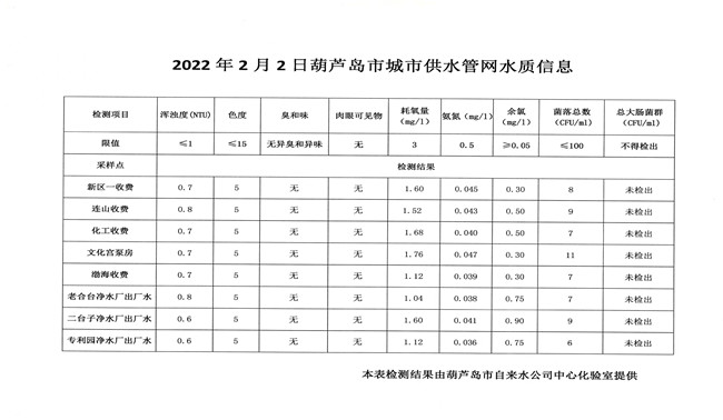 2022年2月2日葫蘆島市城市供水管網水質信息