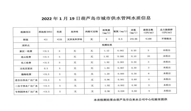 2022年1月19日葫蘆島市城市供水管網(wǎng)水質信息