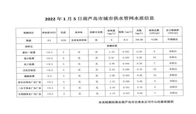 2022年1月5日葫蘆島市城市供水管網(wǎng)水質(zhì)信息