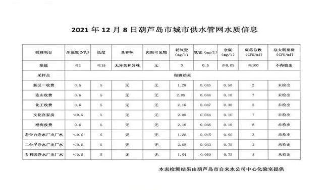 2021年12月8日葫蘆島市城市供水管網水質信息