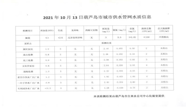 2021年10月13日葫蘆島市城市供水管網(wǎng)水質(zhì)信息