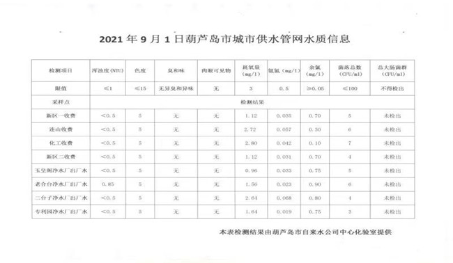 2021年9月1日葫蘆島市城市供水管網(wǎng)水質(zhì)信息