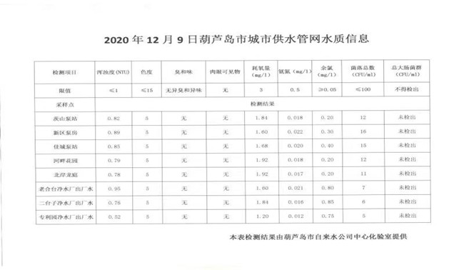 2020年12月9日葫蘆島市城市供水管網(wǎng)水質(zhì)信息