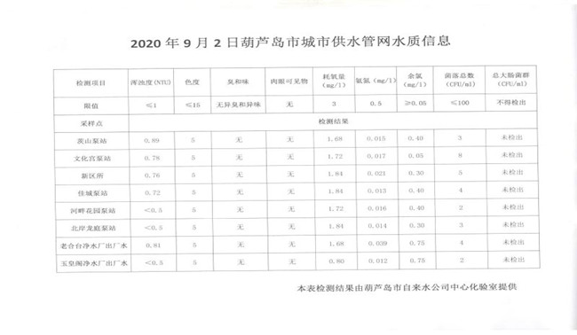 2020年9月2日葫蘆島市城市供水管網(wǎng)水質(zhì)信息