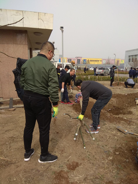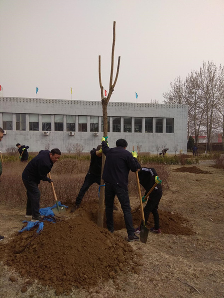 植樹現(xiàn)場,熱鬧非凡。大家分工協(xié)作,挖坑、鏟土、扛苗、扶苗、栽樹、蓋土、澆水等各環(huán)節(jié)都精心對待,各司其職,栽得認真,干得賣力,整個植樹活動現(xiàn)場一片熱火朝天的景象。本次植樹共計49棵,品種多樣,有欒樹、京桃、國槐、銀杏、海棠、玉蘭及中華李。
