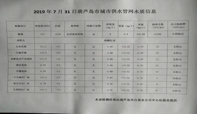 2019年7月31日葫蘆島市城市供水管網(wǎng)水質(zhì)信息