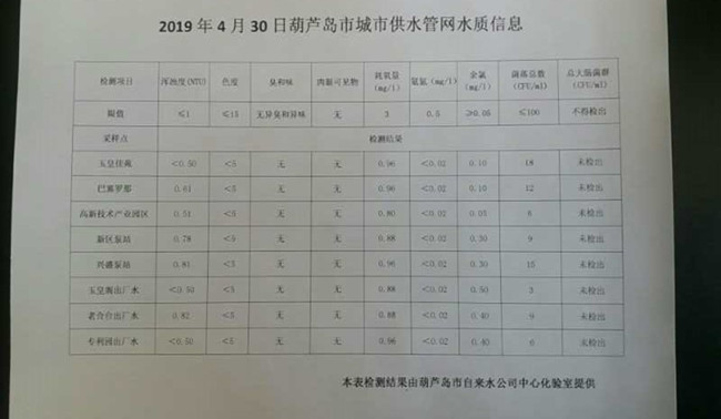 2019年4月30日葫蘆島市城市供水管網(wǎng)水質(zhì)信息