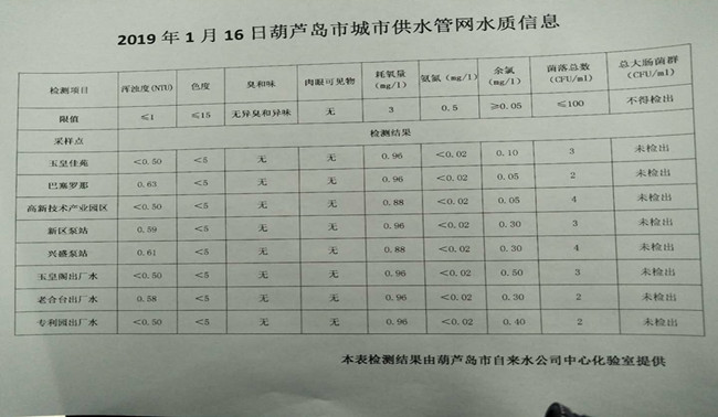 2019年1月16日葫蘆島市城市供水管網(wǎng)水質(zhì)信息