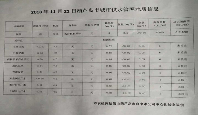 2018年11月21日葫蘆島市城市供水管網(wǎng)水質(zhì)信息
