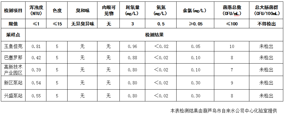 2017年3月1日葫蘆島市城市供水管網水質信息